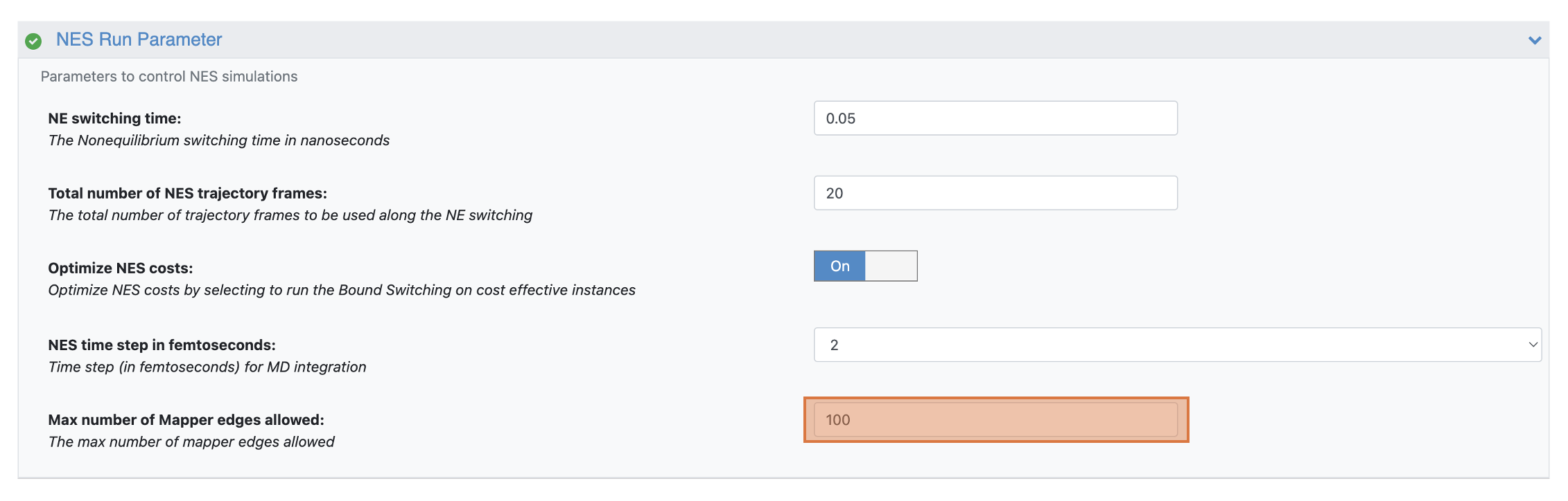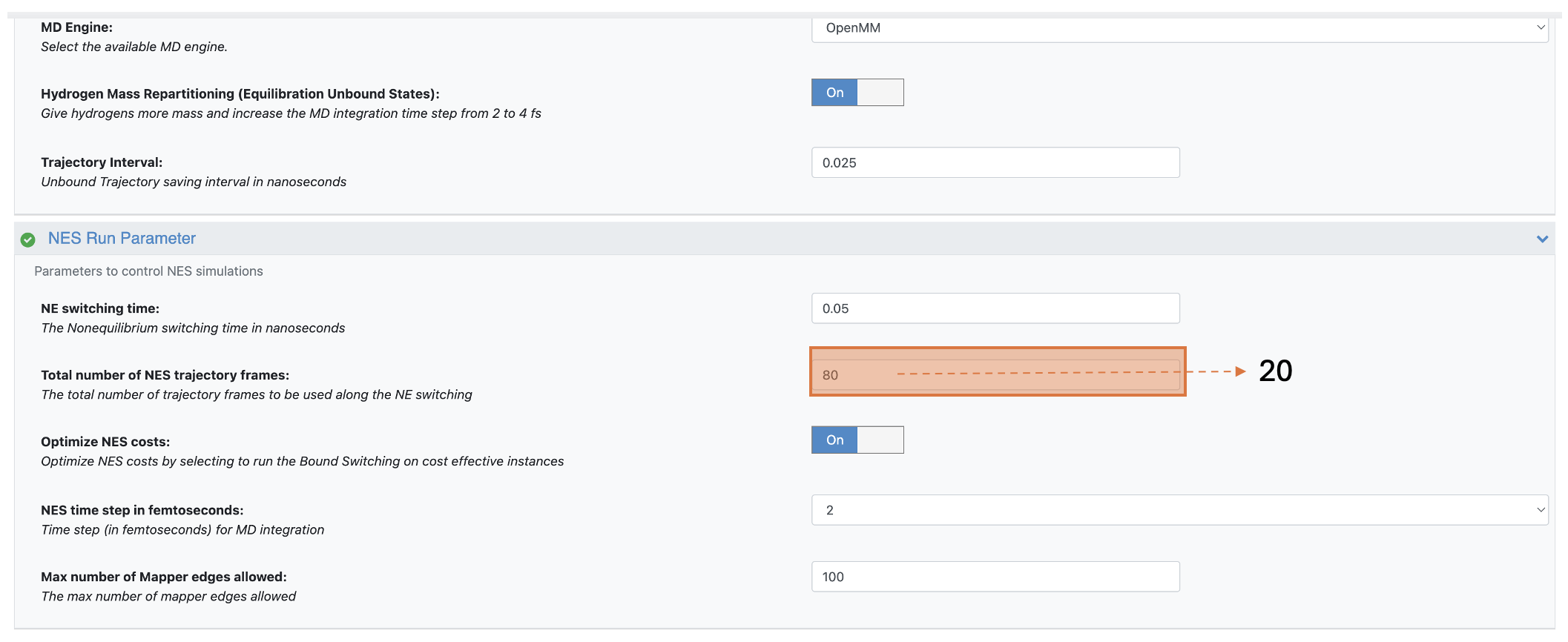 In the NES Run Parameter group, change the Total Number of NES Trajectory Frames to 20. This four times reduction from the default settings helps the alchemical switches finish faster.