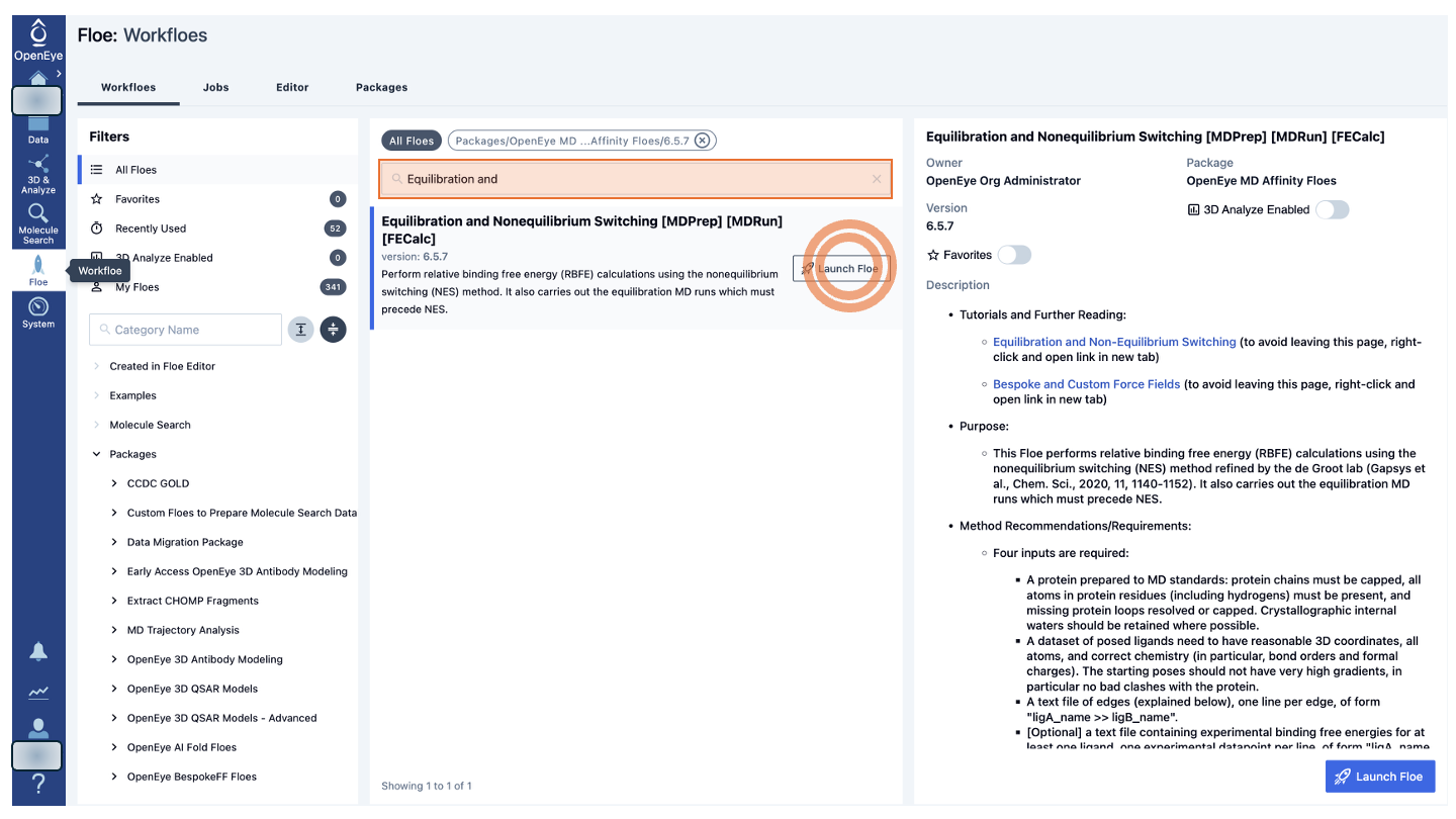 Alternatively, in the center panel, begin typing Equilibration and Nonequilibrium Switching in the search bar until you see that floe appear. Then click the “Launch Floe” button to bring up the Job Form.