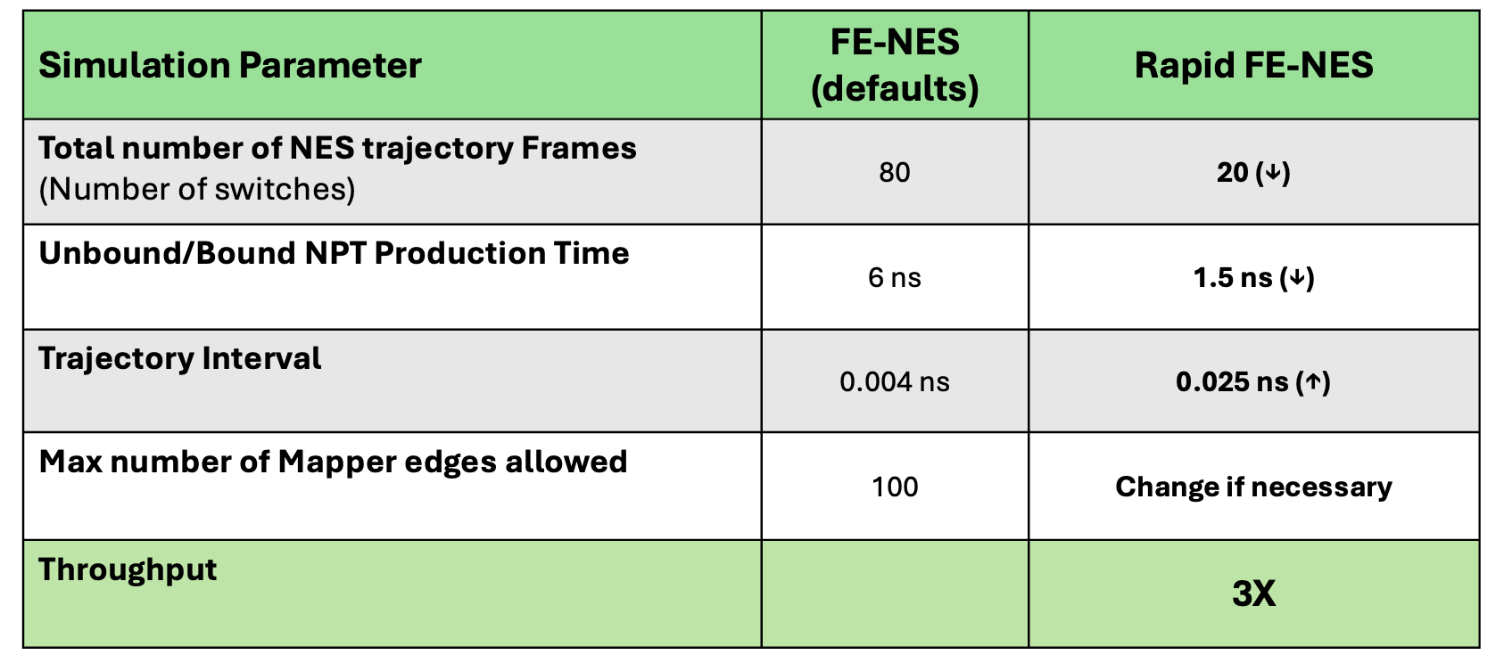 Running Rapid FE-NES with the Equilibration and Nonequilibrium Switching Floe requires configuring three simulation parameters, which are described in this table. These parameters can increase throughput by 3 times compared to FE-NES run with default settings.