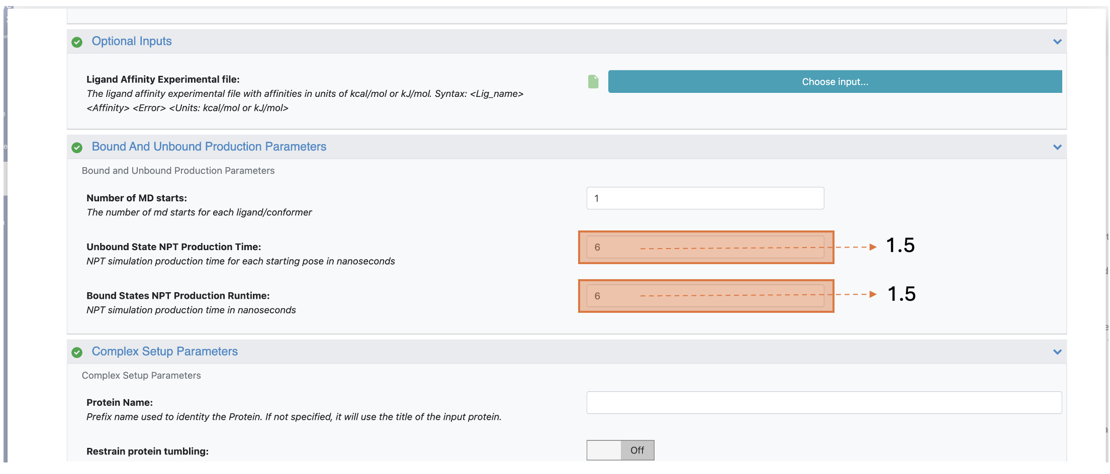 In the Bound and Unbound Production Parameters group, under the Bound/Unbound States NPT Production Runtime parameters, change the simulation production times of the bound and unbound states to 1.5. This four times reduction from the default settings helps the end-state simulations to finish faster.