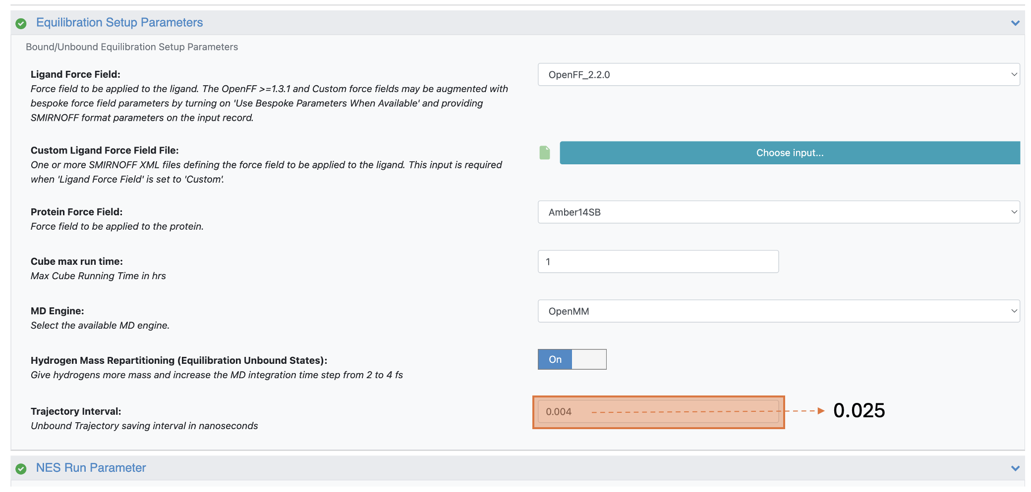 In the Equilibration Setup Parameters group, change the Trajectory Interval to 0.025. This six times increase from the default settings reduces storage costs and increases overall floe throughput.