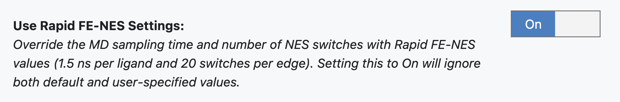 When set to On (default: Off), this will override the MD sampling time and number of NES switches with Rapid FE-NES values (1.5 ns per ligand and 20 switches per edge, as outlined in the table below). These parameter settings can increase throughput by 3 times compared to FE-NES run with default settings.