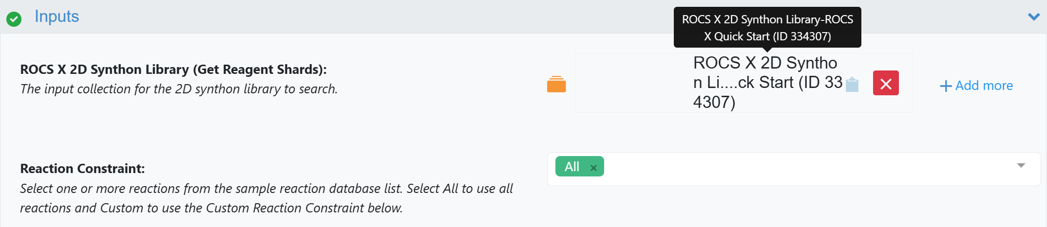 Under Inputs, the 2D synthon library should be loaded into the ROCS X 2D Synthon Library parameter (Figure 1).
