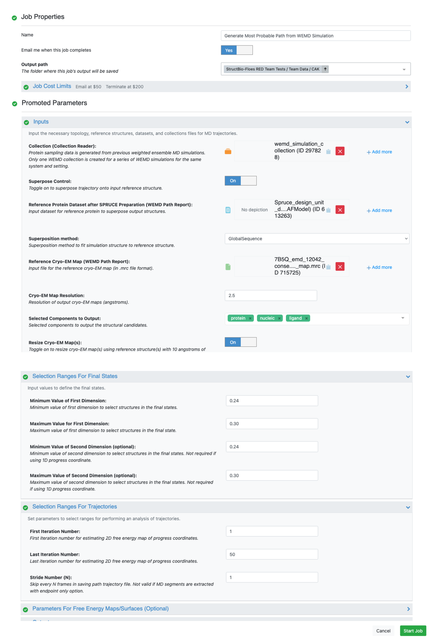 Navigate to the Floe page to find the floe and select the Generate Most Probable Path from WEMD Simulation Floe. Click the “Launch Floe” button to bring up the Job Form.