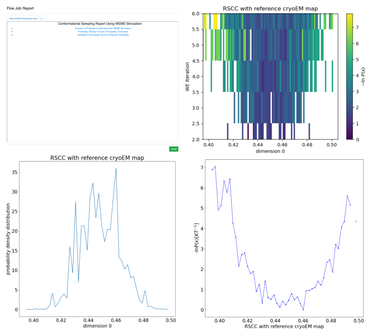 Figure 6. The Start WEMD Simulation and Structure Search Report. Upper left: main page. Upper right: progress coordinate evolution, based on the real-space correlation coefficient (RSCC) to the reference map, as the weighted ensemble (WE) simulation progresses. Free energy, conditional on the starting state, is plotted by iteration (y-axis), with dark blue to light yellow corresponding to free energy minima and maxima. Lower left: final probability distribution of the RSCC with the reference map. Lower right: final free energy conditional on the starting structure.