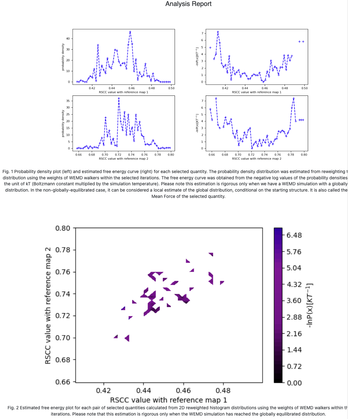Figure 7. The CryoEM Map Match Report. Upper: Probability distribution and free energy conditional on the starting state, for each best structure search target map. Lower: Free energy landscape conditional on the starting state for the two target maps, plotted simultaneously on each axis.