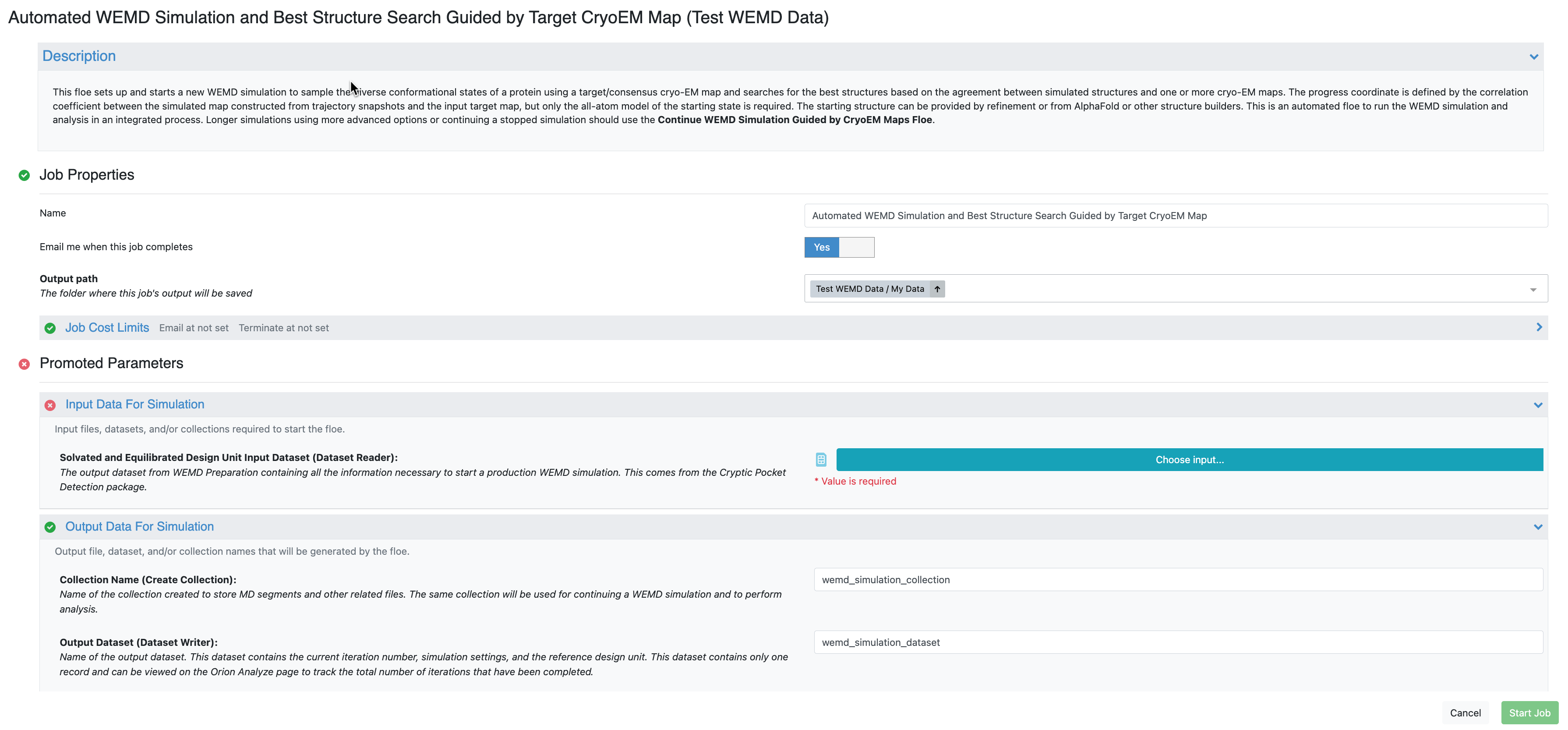 Navigate to the Floe page to find the floe and select the Automated WEMD Simulation and Best Structure Search Guided by Target CryoEM Map Floe. Click the “Launch Floe” button to bring up the Job Form, as shown in Figure 3.