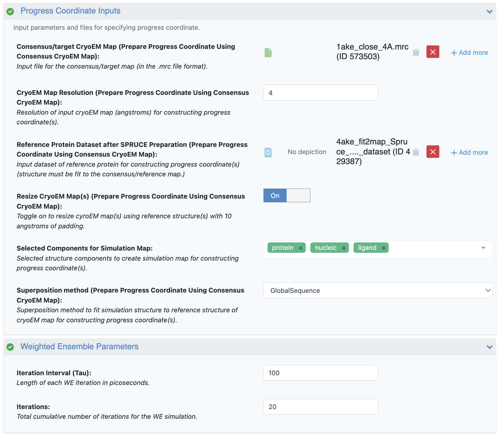 Figure 4. User inputs for the Progress Coordinate Inputs and Weighted Ensemble Parameters.
