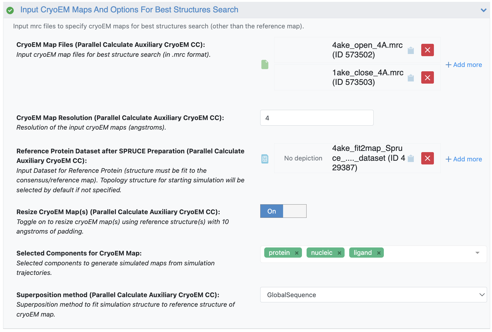 Figure 5. User inputs for the Input Cryo-EM Maps and Options for Best Structures Search parameters.