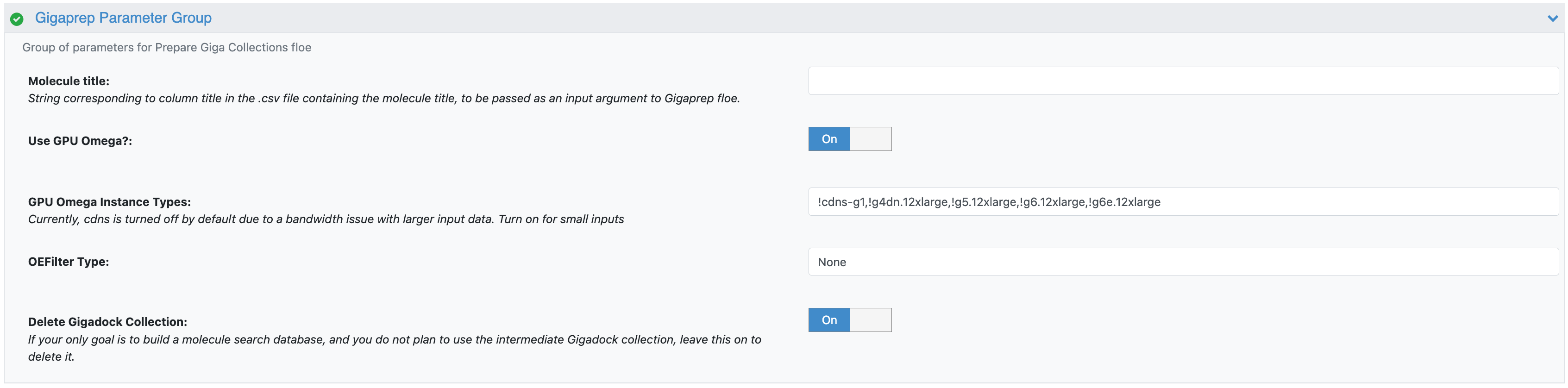 Figure 4. The parameters for the Prepare Giga Collections Floe.