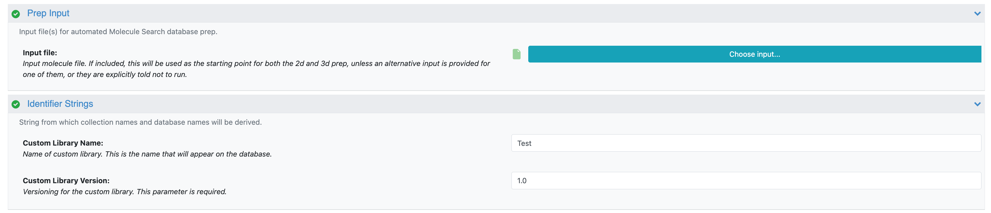 Input File: Click the “Choose Input” button to bring up a list of your existing files and select the input file you want to use. The file must be in .smi, .ism, .cxsmiles, .csv, or .sdf format. When you upload your file, be sure that the “Convert to datasets” box is unchecked.