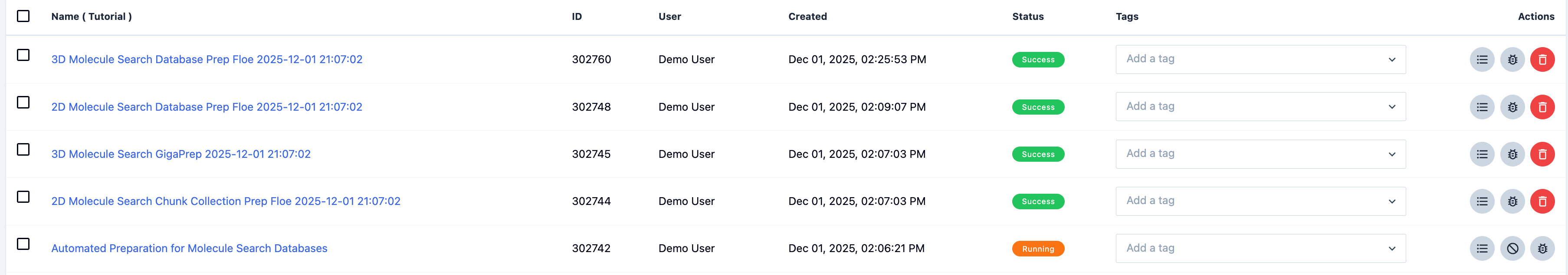 Figure 9. The job list showing the Automated Preparation for Molecule Search Databases Floe and its child floes.