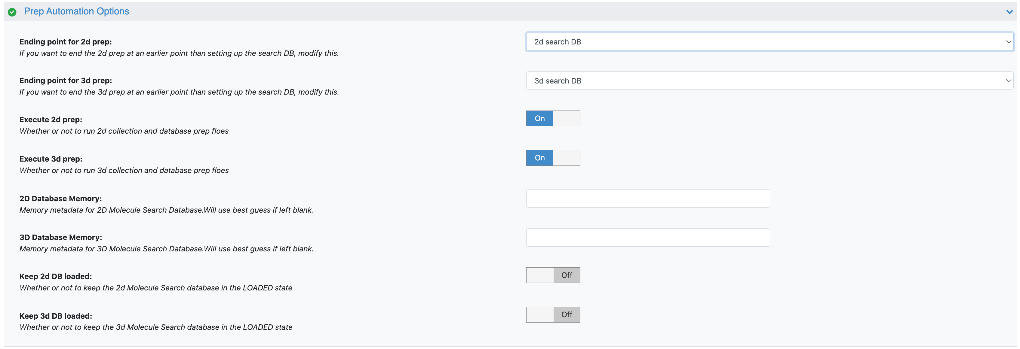 By default, the preparation floe produces a 2D and/or 3D database as the output. After a database is prepared, it will appear automatically as a custom database option on the Database Tab of the System page. At this point, the admin or modeler who created the database can load it for use in molecule searches.