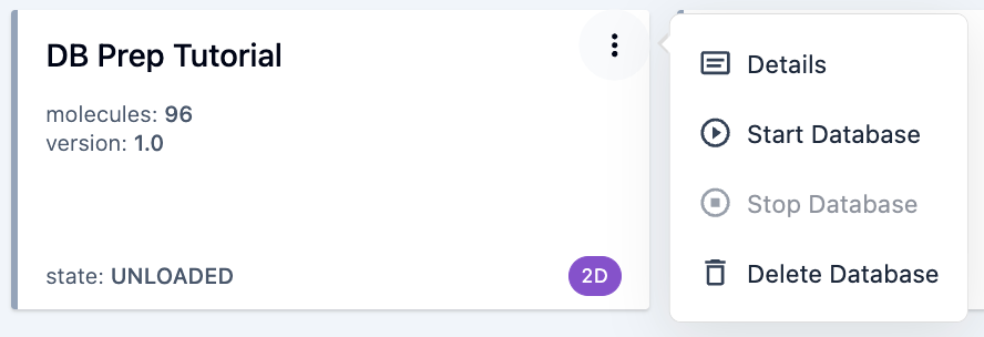 The database tile includes a three-dot menu in the upper right corner. Vendor databases and custom databases which are owned by others include only a “Details” option. This includes additional information about the database. Custom databases which you own include the details option, as well as the ability to start, stop, and delete the database. All custom databases allow you to retrieve the logs for the database for a given time period.